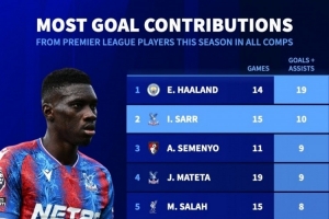 體育資訊11月7日訊 德國轉會市場統計了英超球員本賽季各賽事的參與進球數量,并列出榜單,哈蘭德參與19球居首,薩爾參與10球次席。