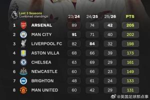 433統計最近三個賽季英超總積分:阿森納排名第一,維拉與紐卡也成功躋身前六??