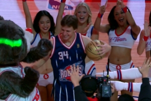 GIF-火箭球迷中場Logo三分打板命中 喜獲25000美元大獎