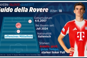 圭多·德拉羅韋雷,這位18歲的攻擊型中場身材高大卻技術細膩,被譽為“擁有細膩的左腳技術”。作為拜仁U23主力,他在地區聯賽中交出了4球9助攻的數據,身價在一年半內增長了六倍。