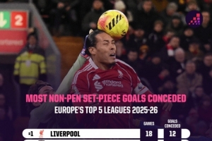 體育資訊12月30日訊 Opta統計了本賽季五大聯賽球隊定位球的失球數量(不包括點球),并列出榜單,利物浦12球居首,這也是2015-2016賽季(15球)之后,利物浦定位球失球最多的賽季。