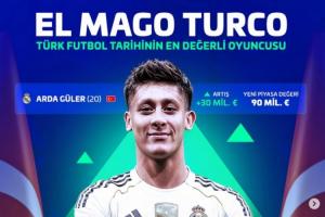 而居萊爾也是第一個達到9000萬歐元身價的土耳其球員,本賽季這位20歲的皇馬中場出戰25次,貢獻3球7助。