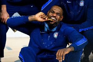 美國籃協官推曬出詹姆斯代表美國男籃奪金的賽場照并寫道:“祝三屆奧運金牌得主??@詹姆斯 生日快樂!????”