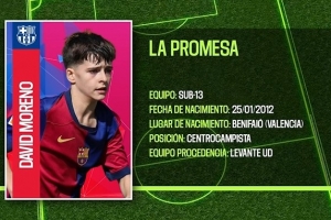 大衛-莫雷諾是巴薩青訓營中最具潛力的球員之一。上賽季,他成為了巴薩所有11人制球隊中最耀眼和最令人矚目的球員。這名左腳中場將在明年1月25日年滿14歲,2023-24賽季從萊萬特加盟后,他已經在巴薩青訓營度過了兩個輝煌的賽季。