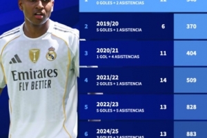 德國轉會市場盤點了羅德里戈加盟皇馬后7個賽季同期出場數據,本賽季他盡管出戰了12場比賽,但出場時間僅為348分鐘。在這個過程中,他送出了兩次助攻。