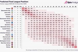 體育資訊12月31日訊 2025年英超比賽結(jié)束,半程過后,槍手領跑英超積分榜。