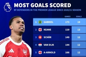 體育資訊12月31日訊 《轉(zhuǎn)會(huì)市場(chǎng)》統(tǒng)計(jì)了20-21賽季以來(lái)的英超后衛(wèi)進(jìn)球情況,槍手中衛(wèi)加布里埃爾獨(dú)自領(lǐng)跑。