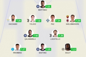 后衛(wèi):拉赫馬尼(那不勒斯,7.27分)、巴斯托尼(國米,7.25分)、歐馬·索勒(烏迪內(nèi)斯,7.13分)