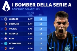 體育資訊1月1日訊 德轉列2025年意甲射手榜,勞塔羅與奧爾索里尼15球并列第一。