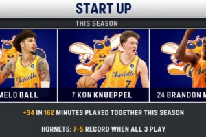 同時,他們?nèi)硕汲鰬?zhàn)的比賽,球隊為7勝5負,而三人沒能同時出戰(zhàn)的比賽,4勝16負。