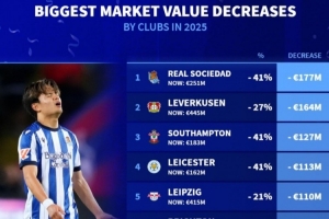 體育資訊1月2日訊 2025年已經結束,《轉會市場》也統計了年度球隊身價貶值榜,皇社、藥廠分列前二。