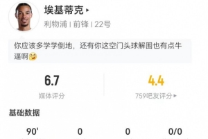 體育資訊1月2日訊 利物浦在本輪英超0-0戰(zhàn)平利茲聯(lián),埃基蒂克本場數(shù)據(jù)如下: