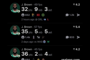 過去5場比賽,布朗四次砍下30+,賽季至今,他場均砍下28.1分。