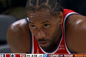 比賽末節8分56秒,小卡上籃時被小克萊頓掃到了面部打出了血,但是爵士居然挑戰成功了,結果變成了小卡被帽、快船出界;