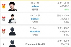 體育資訊1月2日訊 根據排位統計小程序顯示,韓服前十排行榜更新,TES打野選手naiyou登頂。