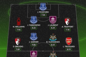 中場:布魯克斯(伯恩茅斯,7.89分)、加納(埃弗頓,9.80分)、吉馬良斯(紐卡斯爾,8.65分)、特羅薩德(阿森納,8.93分)