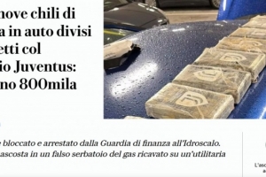 在隨后的搜查中,調查人員在車輛備胎位置改裝的一個假儲氣罐內發現了9公斤可卡因。引人注目的是,這些被壓制成磚塊狀的毒品上均印有尤文圖斯的標志。