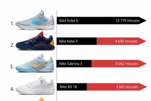 體育資訊1月2日訊 球鞋媒體kixstats統計了12月份NBA球員上腳球鞋的總時長排行,其中科比的兩款球鞋排名前二,Kobe 6依舊是斷檔第一。WNBA球星約內斯庫的Sabrina 3排名第三。
