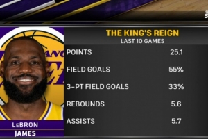 據比賽轉播商Spectrum SportsNet賽后統計,詹姆斯在最近10場比賽中場均得到25.1分5.6籃板5.7助攻,投籃命中率55%,三分命中率33%。