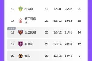 體育資訊1月4日訊 英超第20輪,狼隊3-0西漢姆聯取得聯賽首勝,20輪過后得到6分。目前狼隊距排名第17的森林12分,西漢姆聯沒能縮小差距,仍距森林4分。最新積分榜如下: