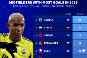 體育資訊1月4日訊 《轉會市場》統計了2025年前十聯賽中場的俱樂部+國家隊各項賽事進球最多情況,塔利斯卡居首。
