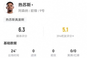 體育資訊1月4日訊 阿森納在本輪英超3-2擊敗伯恩茅斯,熱蘇斯本場數據如下: