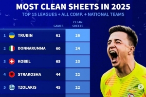 體育資訊1月4日訊 《轉會市場》統計了2025年前15聯賽的門將在俱樂部+國家隊各項賽事總零封場次榜,特魯賓力壓多納魯馬居首。