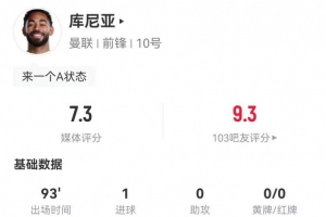 體育資訊1月4日訊 曼聯(lián)在本輪英超對陣利茲聯(lián),庫尼亞本場數(shù)據(jù)如下: