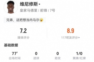 體育資訊1月5日訊 皇馬在本輪西甲對(duì)陣貝蒂斯,維尼修斯本場數(shù)據(jù)如下:
