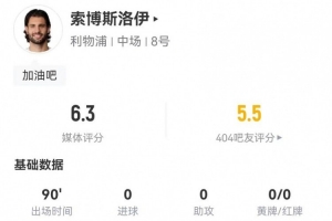 體育資訊1月5日訊 利物浦在本輪英超對陣富勒姆,索博斯洛伊本場客串右邊鋒數據如下:
