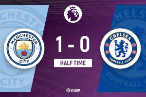 半場結束,曼城暫1-0切爾西。