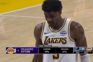 上半場比賽,湖人中鋒艾頓進攻端出手不多但終結很穩3中3,但罰球機會把握不住,僅4罰1中,拿到7分2籃板2搶斷1蓋帽。