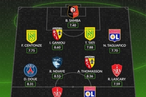 體育資訊1月5日訊 法甲第17輪聯(lián)賽已經(jīng)完賽,whoscored也統(tǒng)計(jì)了本輪評分最佳陣容,南特、朗斯、布雷斯特、里昂各2將入圍。