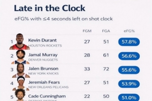 數據美媒Automatic則轉發了一則賽前的數據:本賽季至今,進攻時間最后4秒以內的有效投籃命中率排名前十,杜蘭特57.8%力壓穆雷、布倫森排名第一!