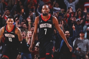 賽后火箭曬出贏球海報,杜蘭特占據(jù)C位,小賈巴里·史密斯同框。