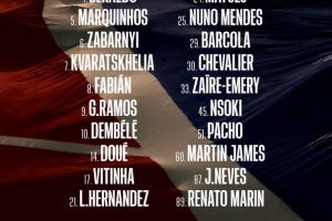 前鋒:7-克瓦拉茨赫利亞、 9-貢薩洛·拉莫斯、10-登貝萊、14-杜埃、29-巴爾科拉