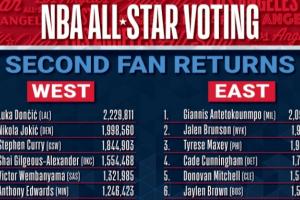 體育資訊1月7日訊 2026年NBA全明星球迷投票首輪結(jié)果出爐,東契奇領(lǐng)跑全聯(lián)盟(票王),字母哥東部第1,約基奇、布倫森和馬克西分列得票總排名前5,庫里西部第3,詹姆斯升至西部第8。