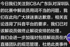 抖音體育官方隨后發(fā)文致歉:今日我們關(guān)注到CBA廣東隊對深圳隊的比賽中解說員用詞不當(dāng)?shù)膯栴},我們在此向廣大球迷表達(dá)歉意,相關(guān)言論違背了抖音平臺的要求,我們已對該解說員做終止解說安排的處理。我們會進(jìn)一步加強(qiáng)對包括解說員在內(nèi)直播團(tuán)隊的規(guī)范管理,杜絕此類事件再次發(fā)生,不斷提升賽事轉(zhuǎn)播的質(zhì)量,為球迷帶來更好的服務(wù)和體驗。