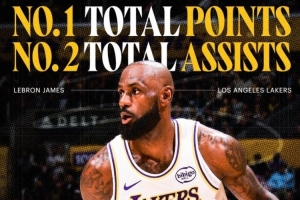 今天,湖人官方曬出了專屬海報,并寫道:“NBA歷史得分王現在還位居總助攻榜第二,勒布朗是獨一無二的。”
