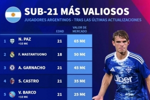 體育資訊1月8日訊 德國轉會市場統計了阿根廷U21球員的身價,并列出榜單,尼科·帕斯6500萬歐居首,馬斯坦托諾5000萬歐次席。