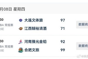 2025-2026賽季WCBA常規賽今日僅兩場B組比賽。B 組頭兩名合肥女籃和大連女籃均獲得勝利。