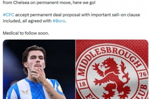 報道稱切爾西接受了包含重要二次轉會分成條款的永久轉會提議,所有細節已與米德爾斯堡達成一致。球員的體檢將在近期進行。