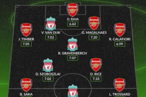 體育資訊1月8日訊 本輪英超將迎來焦點戰利物浦對陣阿森納,數據網站Whoscored也盤點了兩支球隊本賽季英超評分最高陣容,槍手7人在列。具體如下: