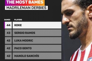 科克超越拉莫斯成為馬德里德比出場最多球員,位居兩人身后的是莫德里奇、亨托以及桑奇斯的42場。