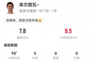 體育資訊1月9日訊 皇馬在本輪西超杯對(duì)陣馬競(jìng),庫(kù)爾圖瓦本場(chǎng)數(shù)據(jù)如下: