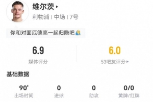 體育資訊1月9日訊 利物浦在本輪英超對陣阿森納,維爾茨本場數(shù)據(jù)如下: