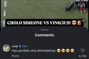 賽后名記羅馬諾在個人社媒賬號轉(zhuǎn)發(fā)了這期沖突的現(xiàn)場視頻,而維尼修斯本人也現(xiàn)身評論區(qū),評論道:“(西蒙尼)又輸?shù)粢粓鎏蕴?。?/strong>
