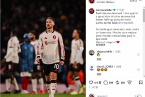 麥卡利斯特社媒曬出比賽照片,并寫道:“對陣一支優秀的球隊,感覺我們配得上更好的結果。仍有很多需要改進之處,但對未來的感覺更好了,加油紅軍!”