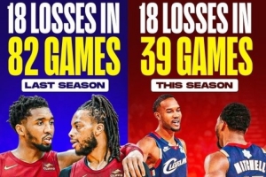 賽季前39場,騎士輸掉了18場。整個上賽季,球隊一共只輸了18場。