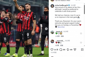 菲爾克魯格社媒寫道:“為我在圣西羅的首秀感到非常自豪,盡管我更希望能以一場(chǎng)勝利來慶祝!
